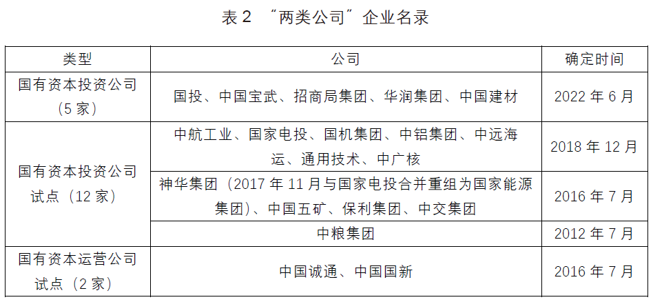 黨的十九大以后,以“管資本”為主線的國企改革進一步提速,政策指引日益清晰。《關于推進國有資本投資、運營公司改革試點的實施意見》從功能定位、組建方式、授權模式、治理結構、運行模式和監督約束機制等對“兩類公司”進行了明確的定義與規范。自2014年起,共有21家央企分三批參與國有資本投資、運營公司試點。目前,“兩類公司”形成5家轉正國有資本投資公司、12家試點國有資本投資公司、2家國有資本運營公司的“5+12+2”格局(見表2)。