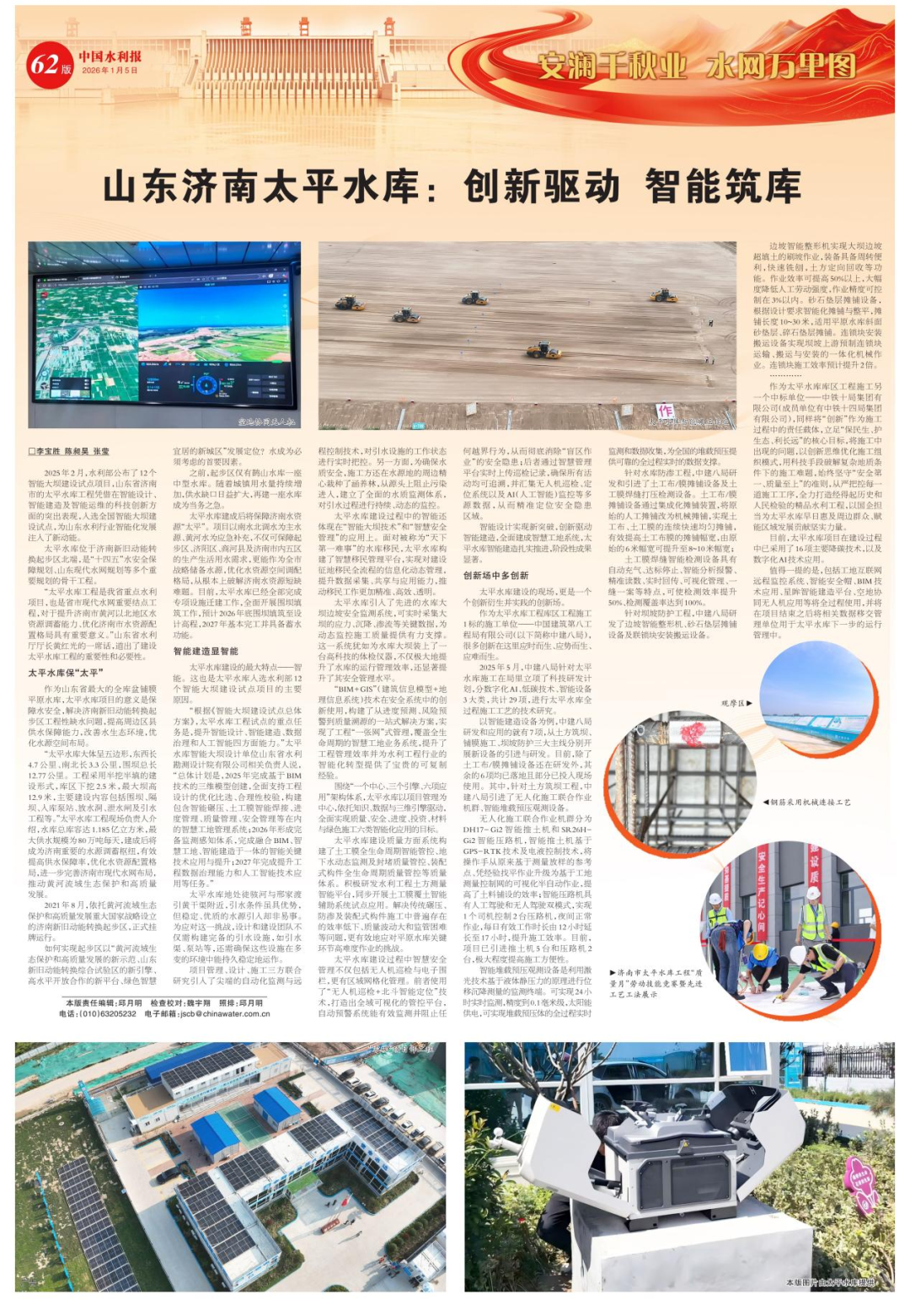 1月5日,《中國水利報》刊登的《山東濟南太平水庫:創新驅動 智能筑庫》通訊稿件中,對濟南城投集團建設的太平水庫工程的重要性以及科技創新方面的突出表現進行了報道。