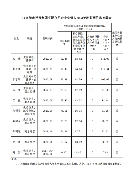 濟南城市投資集團有限公司企業負責人2023年度薪酬信息披露